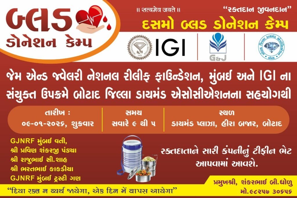 બોટાદ જિલ્લાના હીરા ઉદ્યોગ સાથે સંકળાયેલા રત્નકલાકારો અને અગ્રણીઓ માટે સામાજિક સેવાનું ઉત્તમ ઉદાહરણ પૂરું પાડવા જઈ રહ્યું છે. જેમ એન્ડ જ્વેલરી નેશનલ રીલીફ ફાઉન્ડેશન (મુંબઈ) અને IGI ના સંયુક્ત ઉપક્રમે તેમજ બોટાદ જિલ્લા ડાયમંડ એસોસિએશનના વિશેષ સહયોગથી આગામી તારીખ: ૯ જાન્યુઆરી, ૨૦૨૬ (શુક્રવાર) સવારે ૯:૦૦ થી સાંજે ૫:૦૦ કલાક સુધી મહા રક્તદાન કેમ્પનું આયોજન કરવામાં આવ્યું છે.આ અંગે વધુ માહિતી આપતા બોટાદ જિલ્લા ડાયમંડ એસોસિએશનના પ્રમુખ શ્રી શંકરભાઈ ધોળુંએ જણાવ્યું હતું કે, આ સંસ્થાઓ દ્વારા યોજાનારો આ ૧૦મો બ્લડ ડોનેશન કેમ્પ છે. માનવતાના આ કાર્યમાં સહભાગી થનાર દરેક રક્તદાતાના ઉત્સાહને વધારવા માટે સંસ્થા તરફથી પ્રોત્સાહન રૂપે સારી કંપનીનું ટિફિન ભેટ આપવામાં આવશે.ડાયમંડ એસોસિએશન દ્વારા બોટાદના તમામ રત્નકલાકારો અને શહેરના નાગરિકોને આ કેમ્પમાં મોટી સંખ્યામાં જોડાઈને રક્તદાન કરવા અને પુણ્યનું ભાથું બાંધવા હાર્દિક આમંત્રણ પાઠવવામાં આવ્યું છે.
